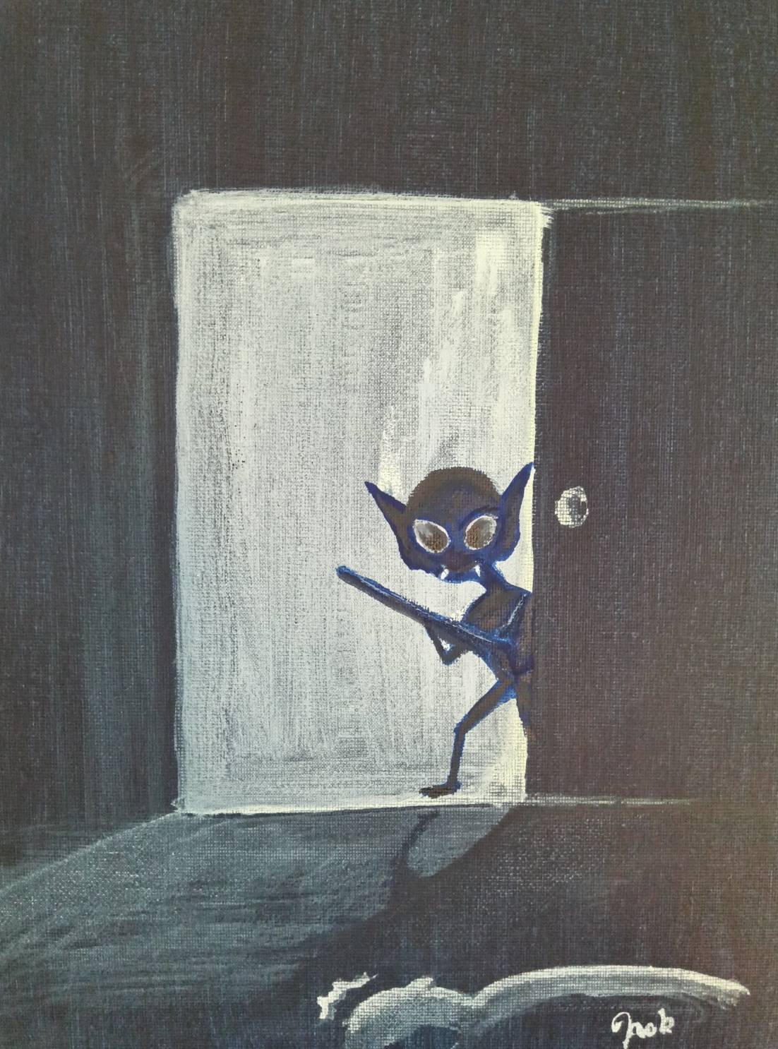 暗がりの部屋から、ふと、明かりのある廊下を見ると、身長1mくらいの宇宙人がこちらを見て立っていました。